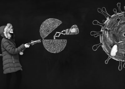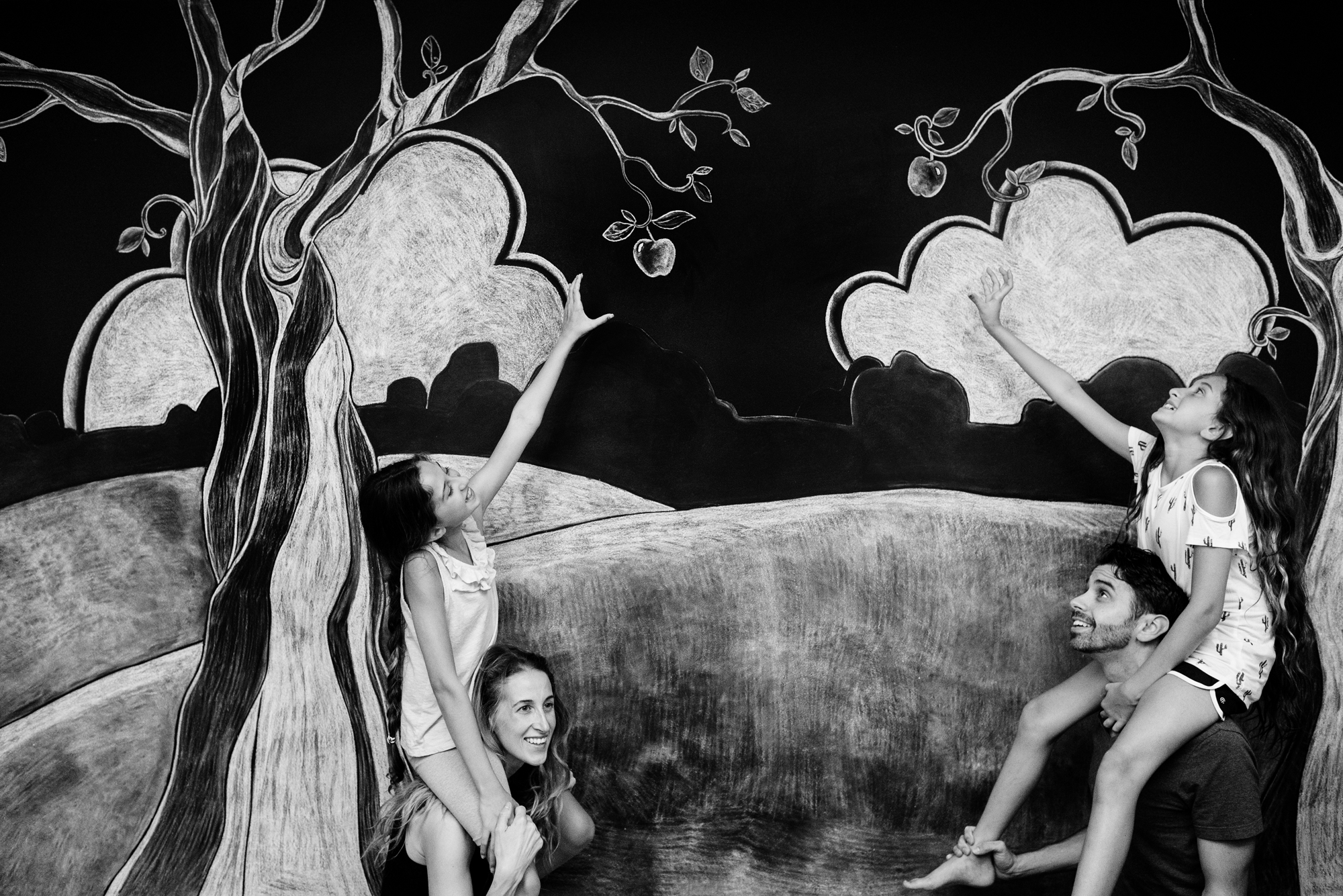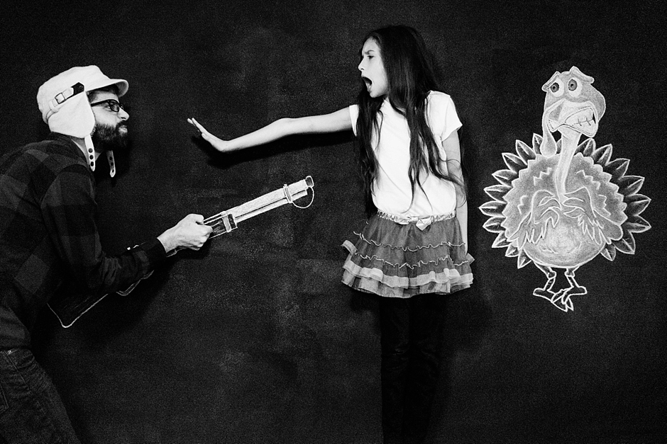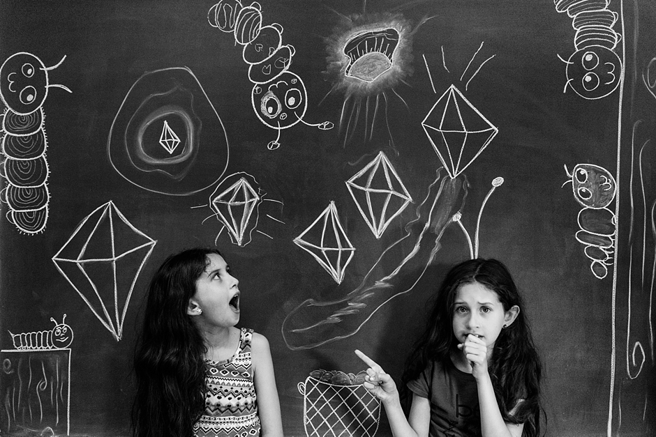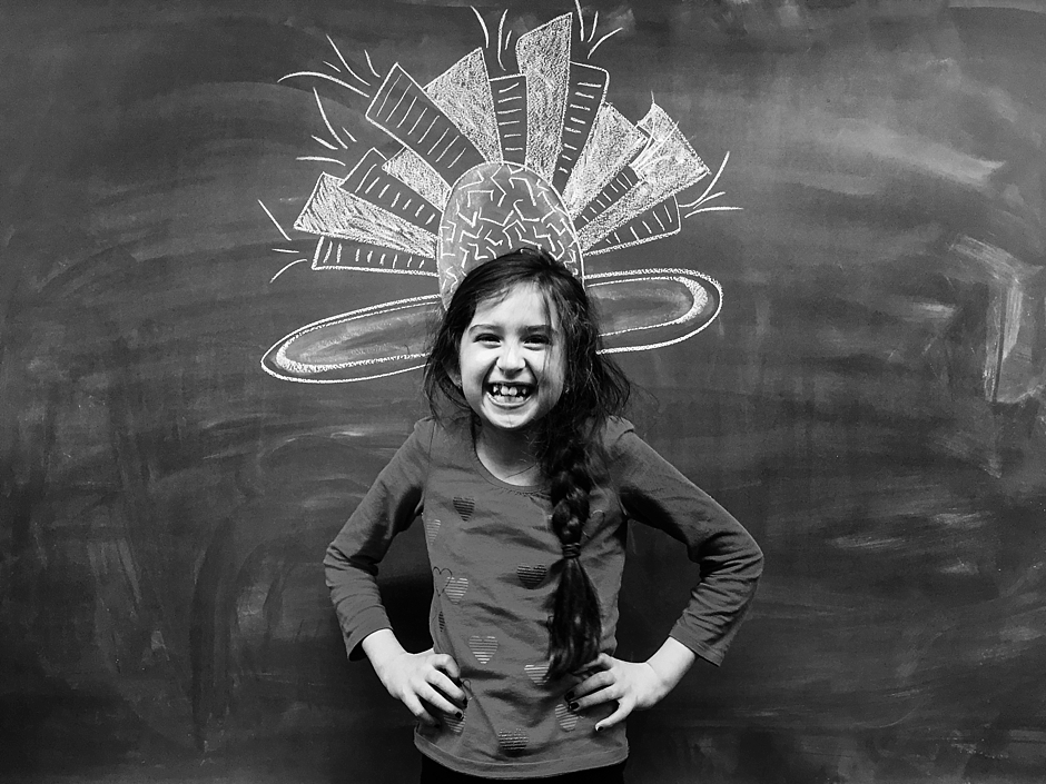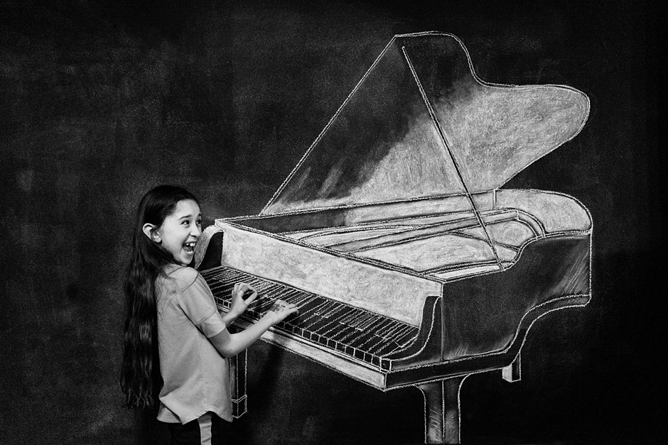 This whole thing started in January 2015. I was at the church where my daughters took piano lessons. While one had her lesson, I’d hang out in a nearby classroom with the other. One day, on a whim, I sketched something on the chalkboard and took a picture of her in front of it. We had so much fun that it became our weekly ritual, each lesson, a new drawing.